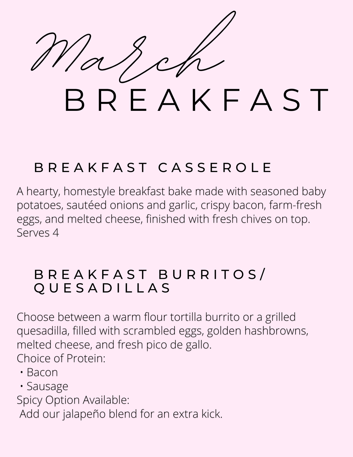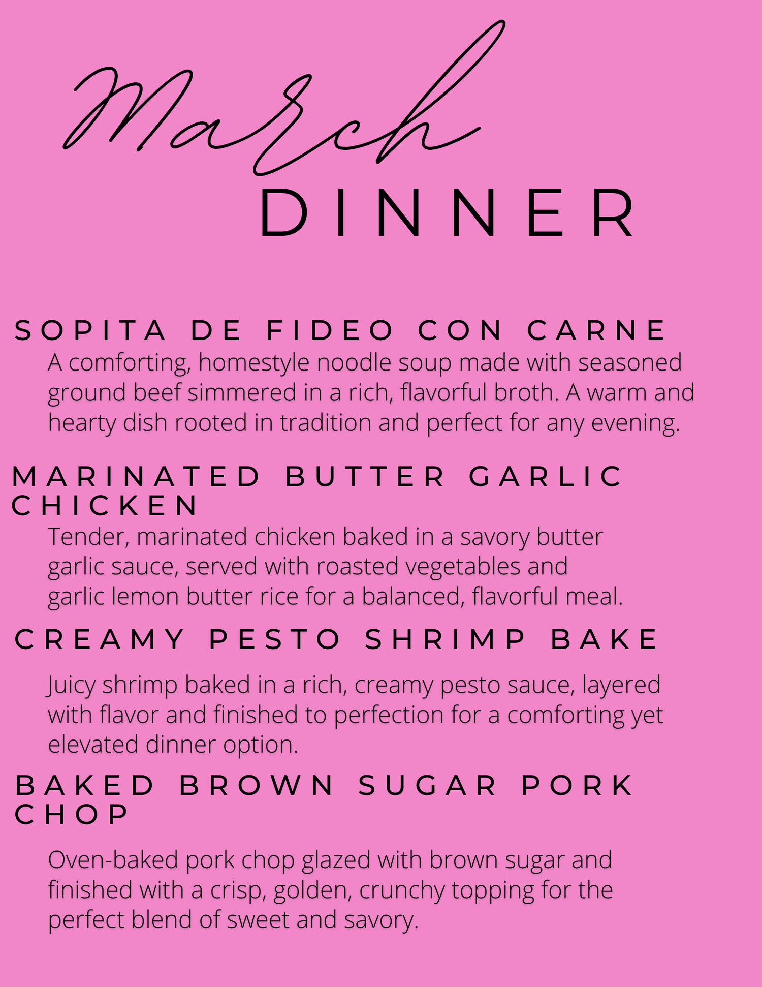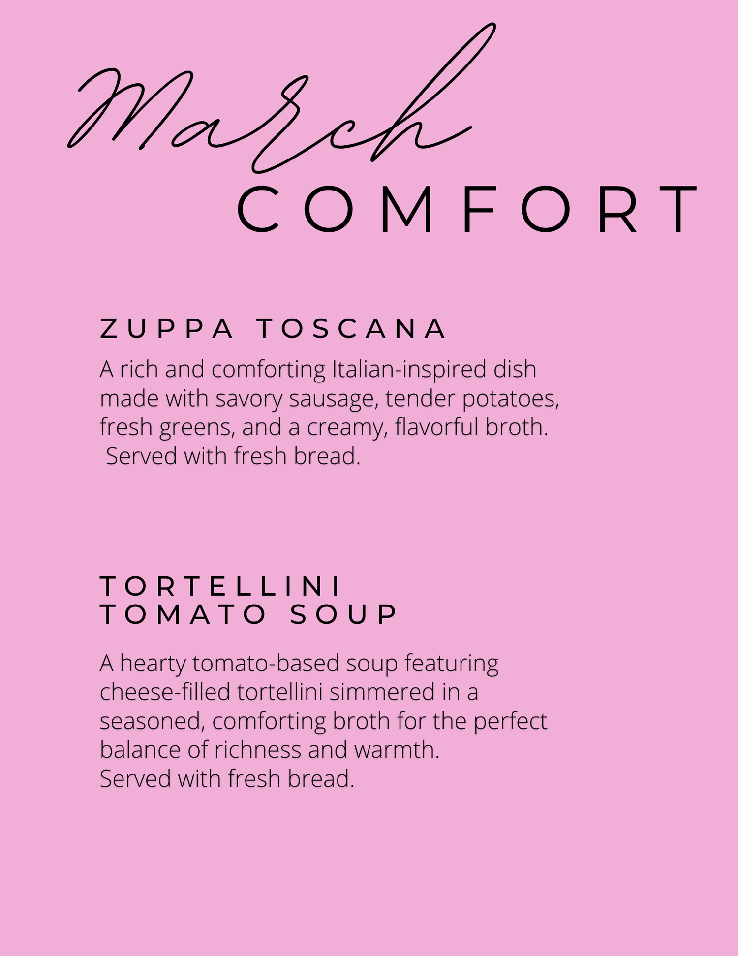 Each month, we offer a set monthly meal menu available by sign-up, designed to provide comforting, balanced, and flavorful meals that make life easier. Menus are released monthly, giving clients something dependable to plan for while still enjoying variety and seasonal favorites.