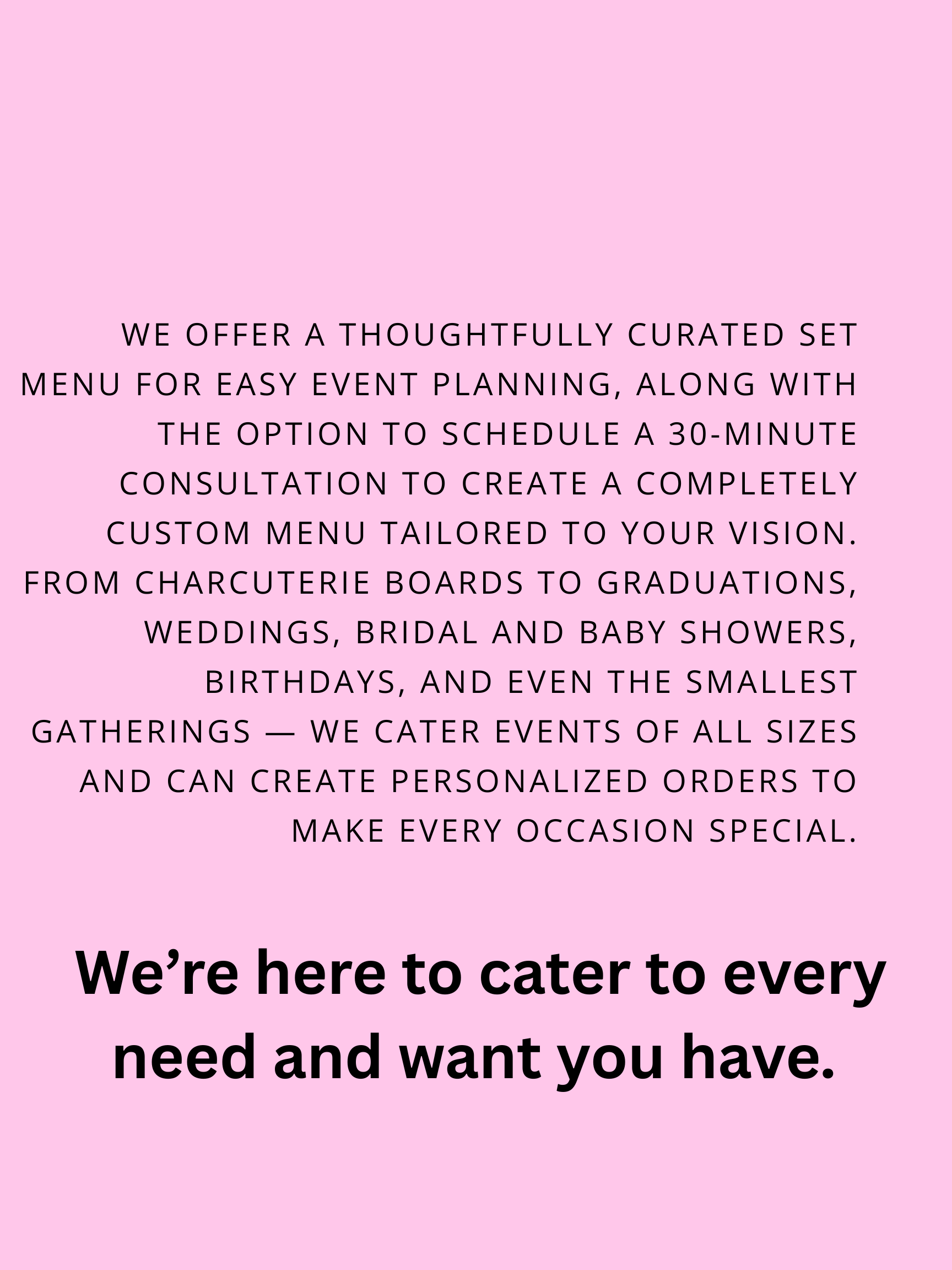 In addition to our monthly meals, we provide fully custom catering services, creating personalized menus for events of all sizes.